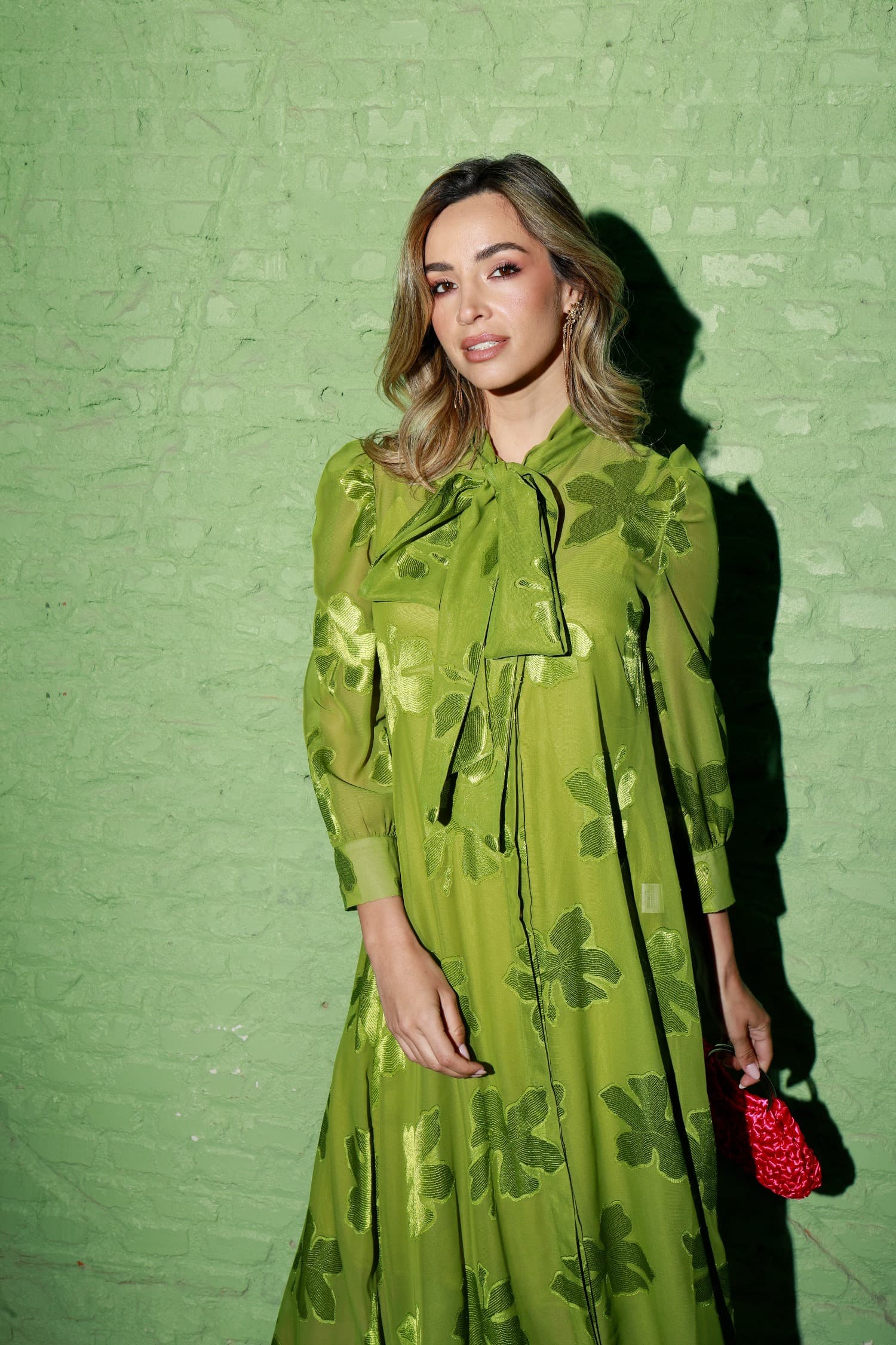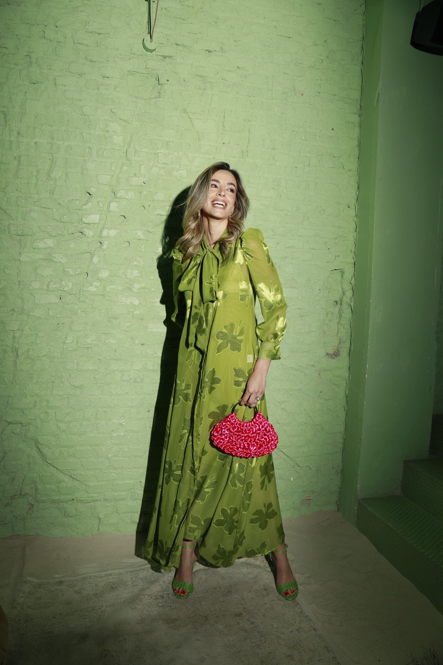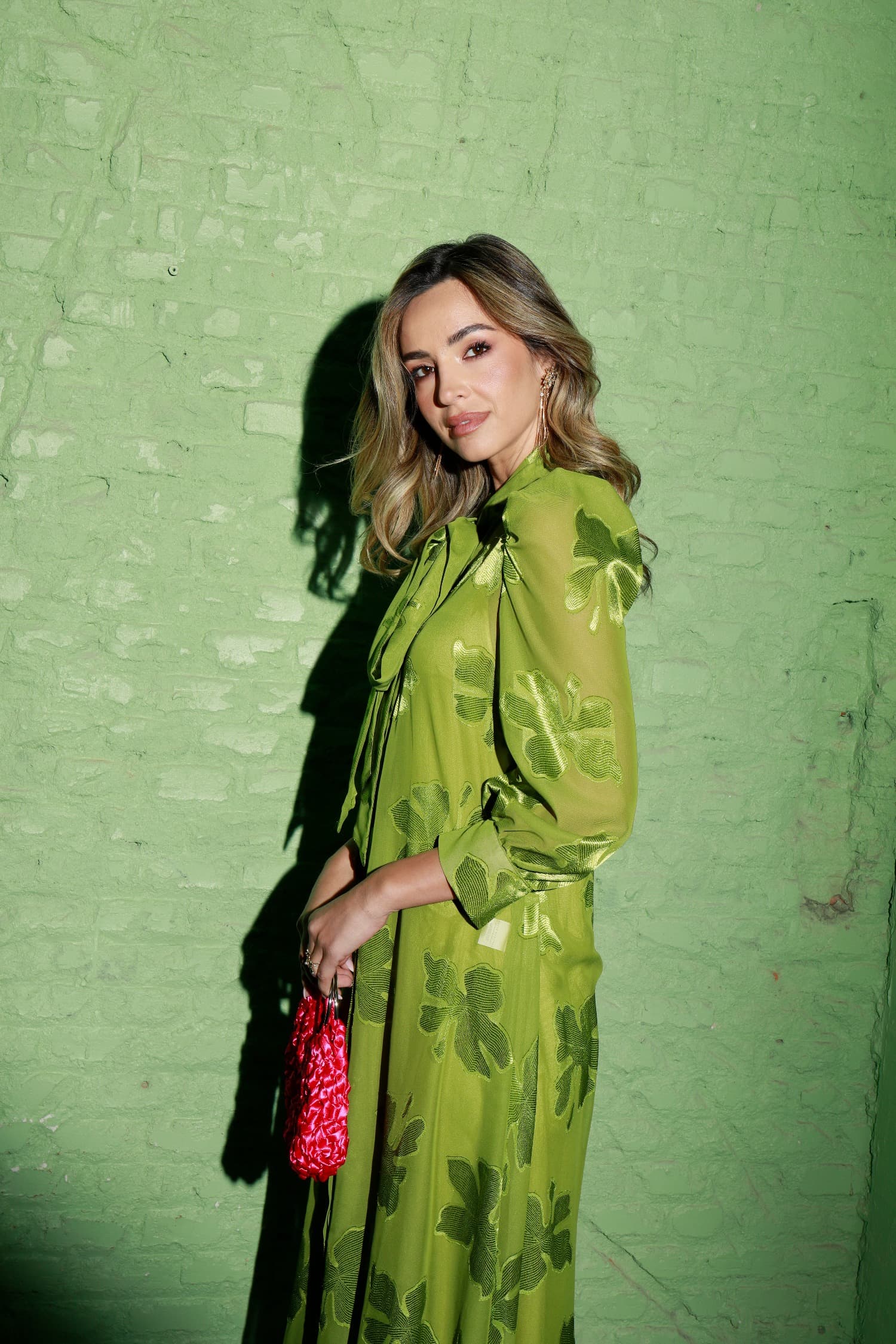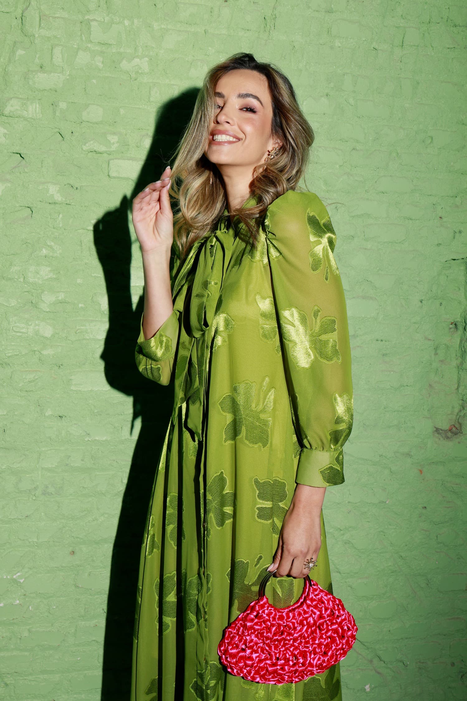 Long dress crafted in floral jacquard chiffon. Includes an inner slip dress in lime. Front button closure and adjustable tie that allows for multiple styling options.