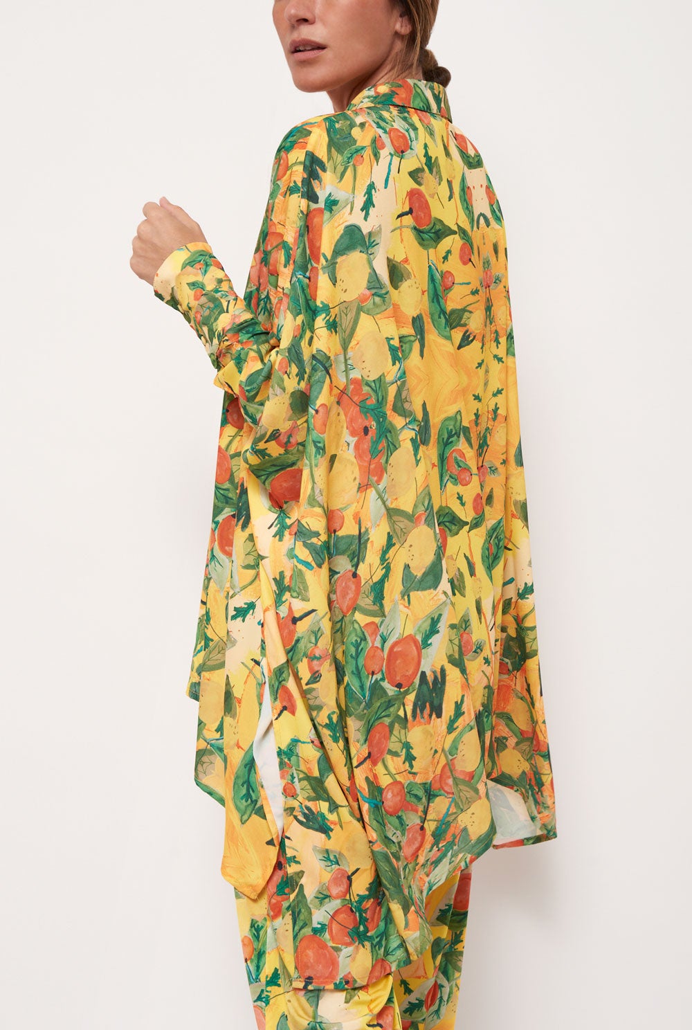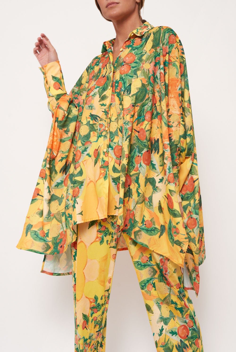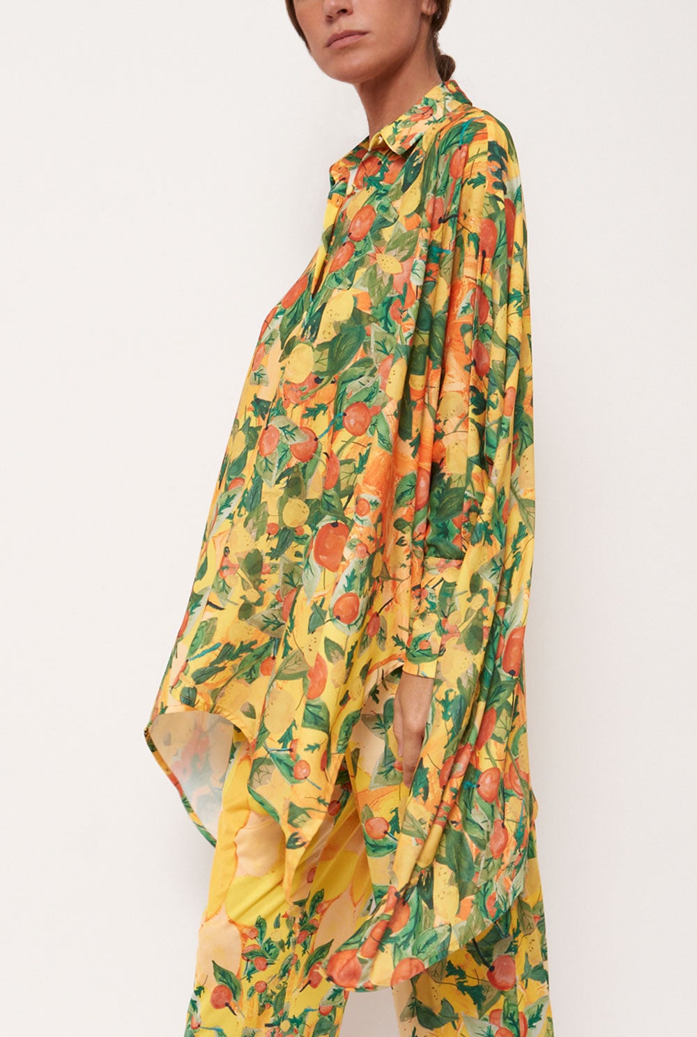 Wide bat-cut shirt with lapel collar. Long sleeves with dropped shoulders. Asymmetric hem.